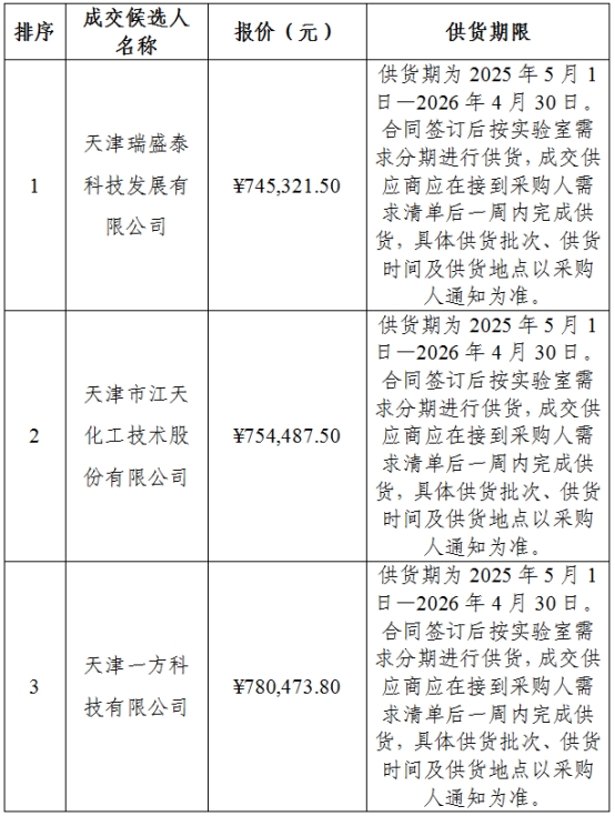 南水北調(diào)中線(xiàn)天津分公司水質(zhì)監(jiān)測(cè)中心2025年藥品、易耗品采購(gòu)項(xiàng)目成交候選人公示