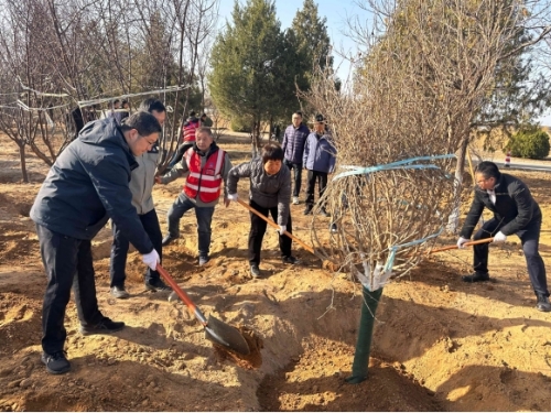 參加植樹的干部職工分工協(xié)作,立直苗木、回填泥土,踩平樹坑、圍堰澆水,一幅熱火朝天的勞動(dòng)場(chǎng)景。經(jīng)過大家的辛勤勞作,新栽種的60余株榆葉梅、木槿和金葉國(guó)槐排列整齊,迎風(fēng)挺立。